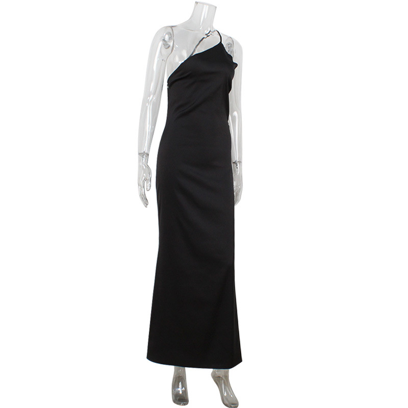 Women Slim Fit Elegant Diagonal Collar Strap Backless Solid Color Mop Evening Dress Women
